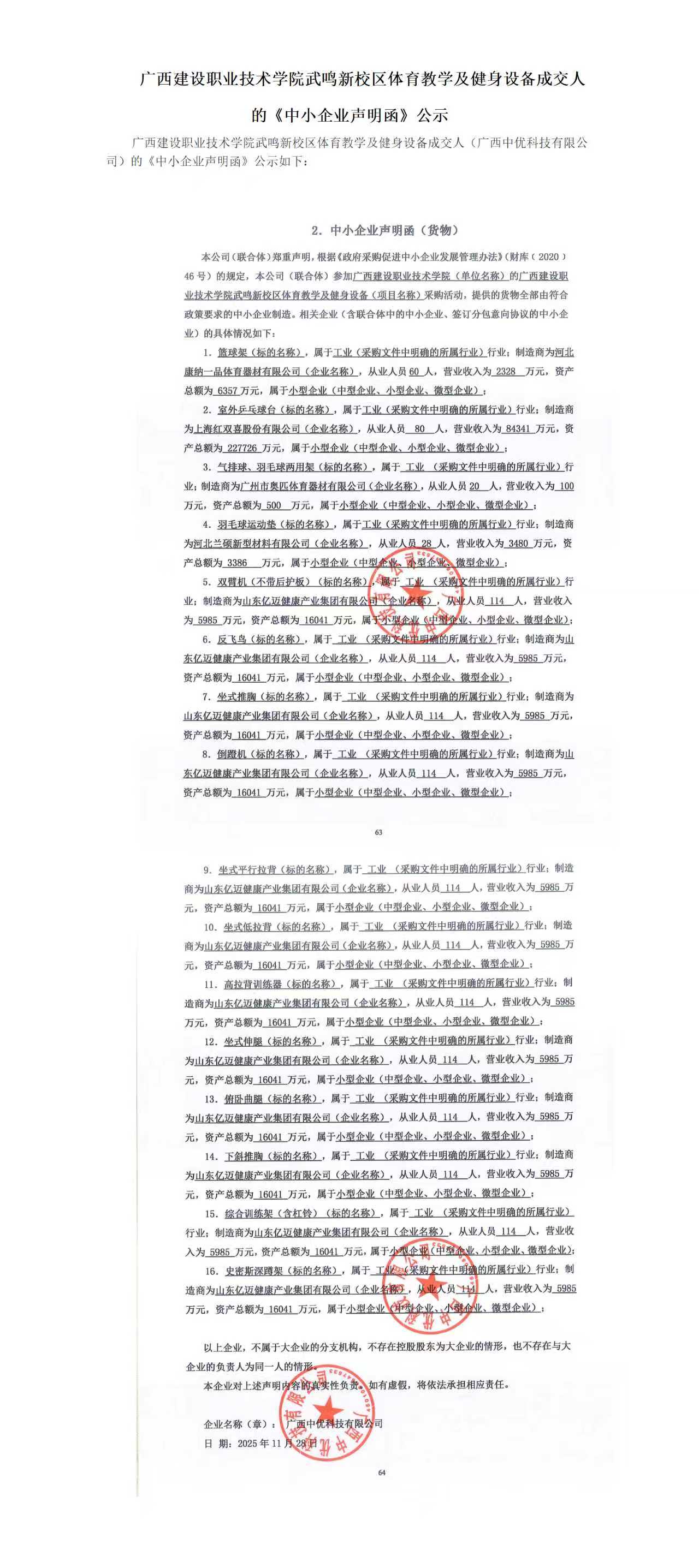 广西建设职业技术学院武鸣新校区体育教学及健身设备成交人的《中小企业声明函》公示